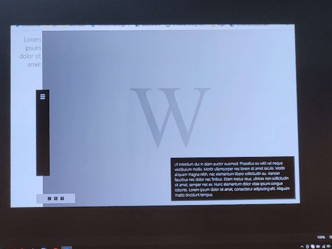 The W page had more elements. I started by adding a gradient background and a white strip on the left side for text. Then, I positioned a black textbox in the bottom right corner and another black box along the border of the white strip. Finally, I placed a menu button using a PNG image.
