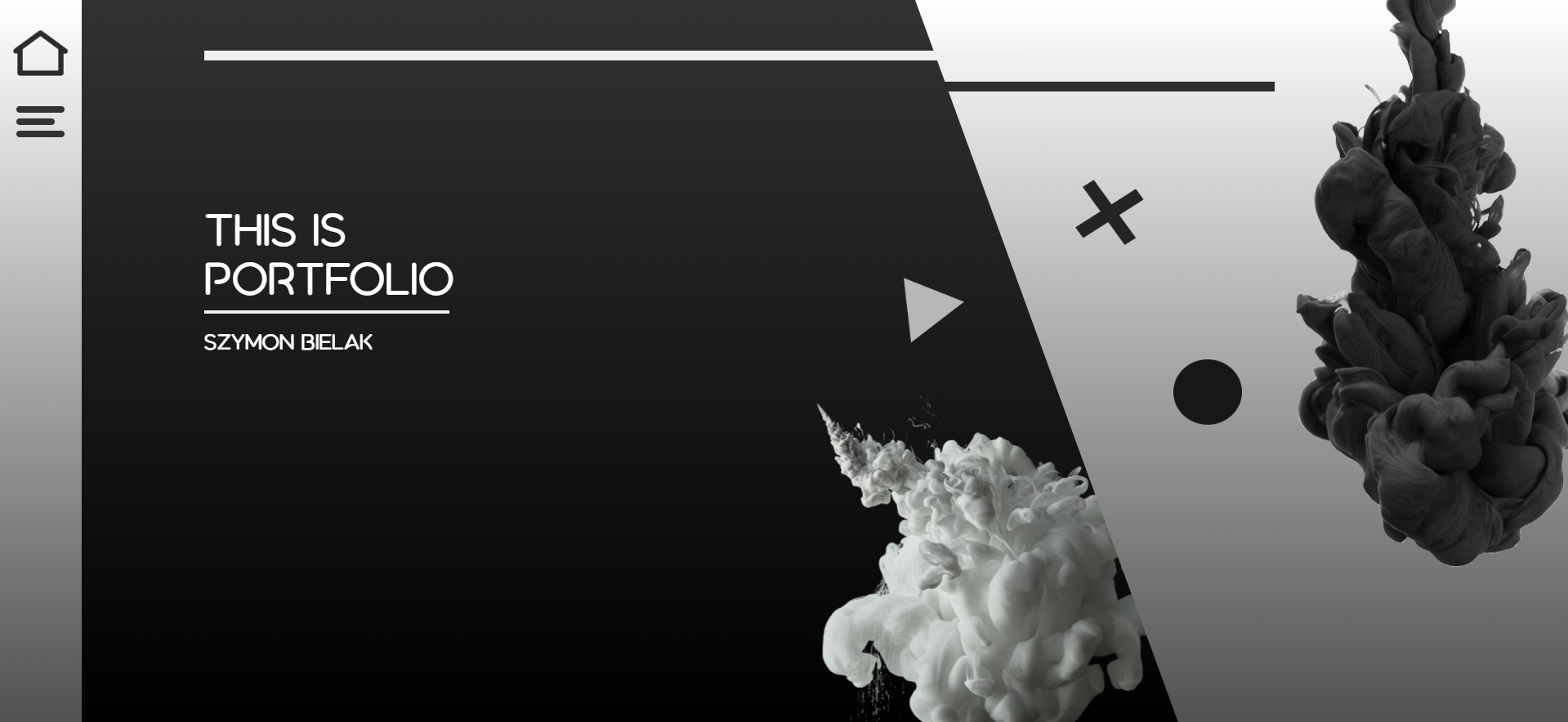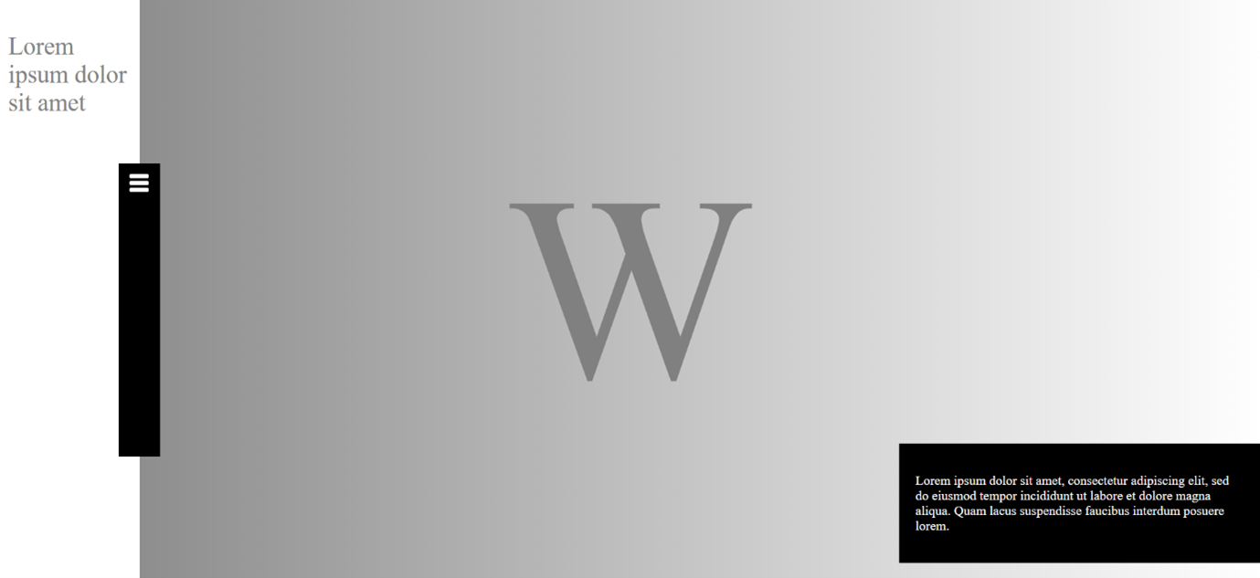 The W page had more elements. I started by adding a gradient background and a white strip on the left side for text. Then, I positioned a black textbox in the bottom right corner and another black box along the border of the white strip. Finally, I placed a menu button using a PNG image.