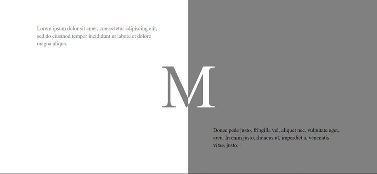 The M page was simpler, featuring a split layout achieved using CSS classes which code I found on w3schools. I used a linear gradient to partially color the M container and added text boxes with Lorem Ipsum content.
